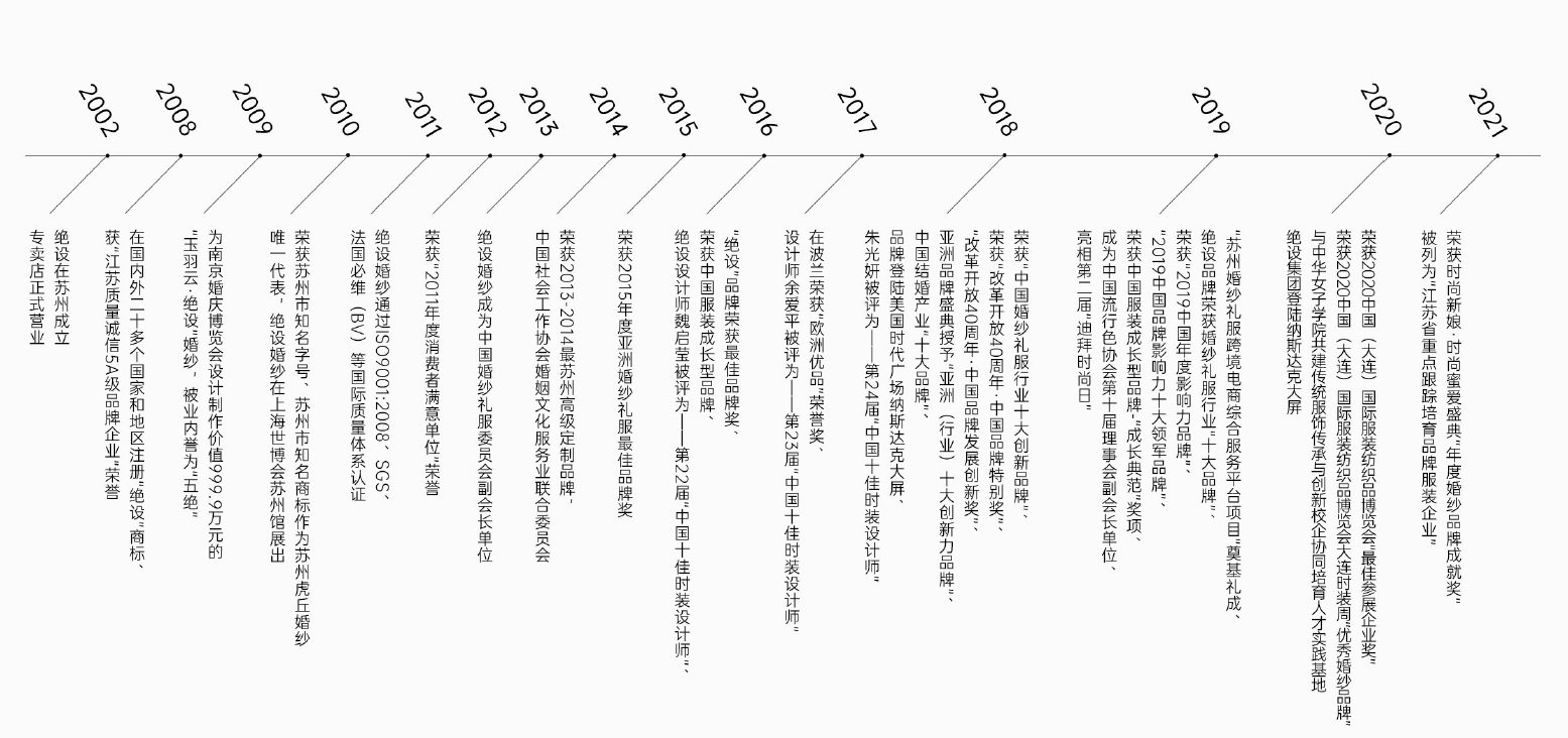 2002年,绝设在苏州成立。集团旗下拥有“JUSERE绝设”,“天玺”,“Shineshere行设”三大品牌,产品涵盖婚纱、礼服与中式嫁衣等领域。